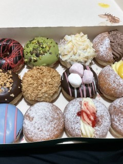 Upside Down Donut, Hawkins Crunch Donut, Fairy Floss (White Choc Filling), Jam (Jam Filled), Pistachio Donut, Salted Caramel Crunch (Salted Caramel Filled), Lemon Coconut (Lemon Curd Filled), Rocky Road (Jam Filled), New Zealand Style Fresh Cream & Jam, Chocolate Mousse, Blueberry Cheesecake, Lemon Cheesecake